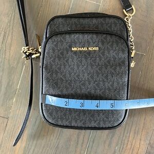 This Michael Kors Crossbody purse, has some wear on the strap with some of the edging coming off. Otherwise, the bag is in good used condition.