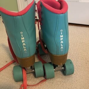 Slightly used roller skates from Impala. Size 8/39. Bright turquoise with pink laces. Super cute! See photos for condition. Offers welcome! PS can ship with or without box