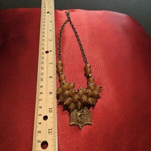 This exquisite antique necklace showcases a vintage sports medal, elegantly displayed among charming acorn-shaped beads. The combination of the medal and the intricately designed Acorn Amber beads creates a truly unique piece, making it a rare treasure for any jewelry collector.