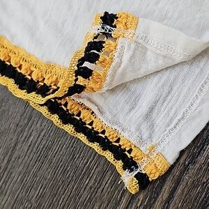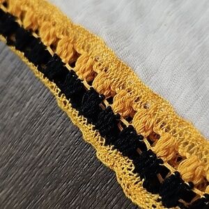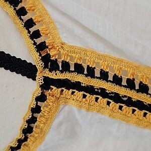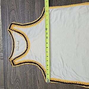 This cream tank features yellow and black contrasting crochet accents around the neckline and side seams. with a racerback look to the back of the tank.