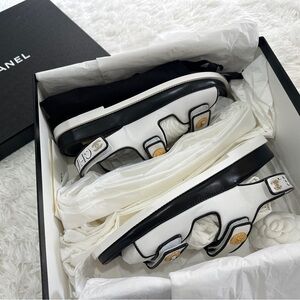 Black and white lambskin with gold charms and CC studs. The details in these sandals are spectacular!!