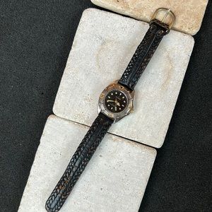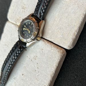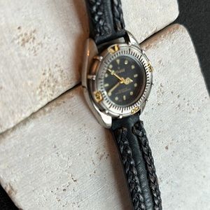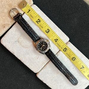 Very versatile and attractive. Black face. Water resistant. Keeps good time. Has second sweep hand. Luminous number markers and hour and minute hands. Numbered bezel. Has genuine black leather braided band. Wear it for sports or everyday. Needs battery.