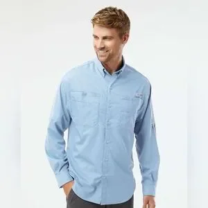 Columbia Mens Powder Blue Pfg Upf Button Up Long Sleeve Shirt Size Large