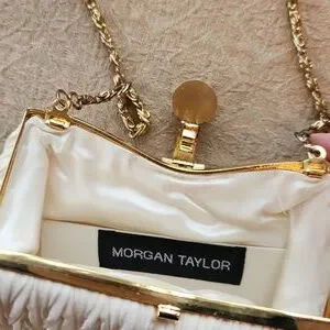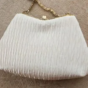 Ruched Ivory satin with gold tone jeweled clasp and top 25 inch chain strap.