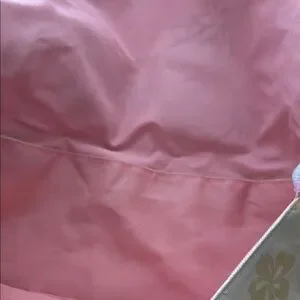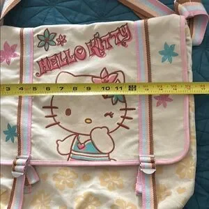 Adorable Hello Kitty tote bag with floral Hawaiian accents. Features cream, pink, and teal colors.