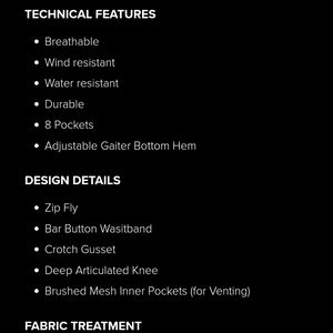 These are very good condition, worn once, outdoor pants. They have zippered pockets front and back and a cinch cuffs. They also have gusseted knees for flexibility.
