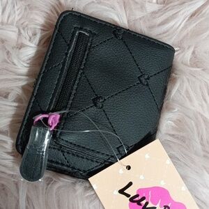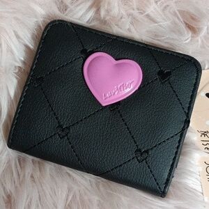 Betsey Johnson Black Heart Quilted Hearts Pink Stripe Square Bi-fold Wallet