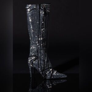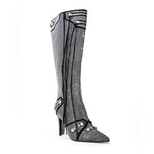 The Xena Black AZALEA WANG Maeve Stiletto Boot in Silver is a sparkling rhinestone-embellished boot featuring a pointed toe silhouette, a faux suede base, a slim stiletto heel, and a knee-height shaft. Complete with faux buckle accents throughout, faux silver metallic hardware, top zip detailing, tassel trim, an all-over rhinestone design, and a classic inner ankle zipper closure. Style with a sleek mini skirt and a faux leather jacket for a complete look.