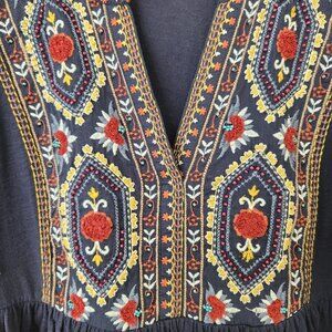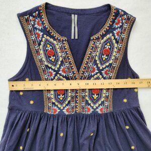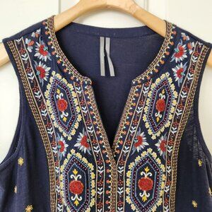 This sleeveless navy top features intricate embroidery with vibrant patterns and floral designs. Cute peplum style, navy blue color, lightweight and soft cotton. Size Small.
