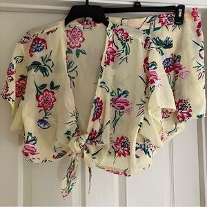 Top: Super cropped, relaxed short sleeves, tie-front style, plunging neckline