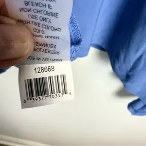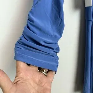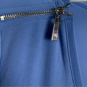 Stylish blue V-neck top with zipper details. Perfect for any occasion.