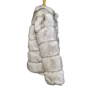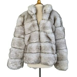 GUESS Oversized Faux Fur Jacket Gray Puffer Zip Up Coat SUPER SOFT Furry Sz Large