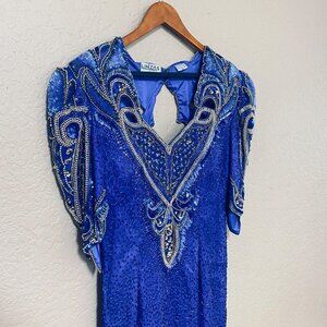 This dress is a showstopper. Gold, blue and silver beadwork lay atop the blue backdrop. Swirling sequin pattern throughout. Very small pull as pictured. If there is any other pull is is very small and not seen easily and does not effect this dress's beauty. Zips in back under the large 15 inch keyhole. 23.5 inch split in back.