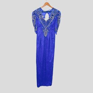 Linzas Vintage Y2K Straight Dress Gown Size Medium Blue Silk Sequined