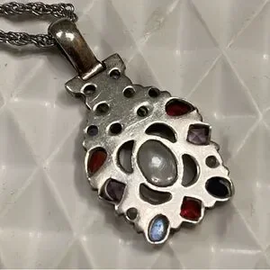 Beautiful vintage sterling silver pendant featuring a rainbow of genuine gemstones: moonstone, garnet, amethyst, peridot, and more. The luminous moonstone is the centerpiece, accented by a lotus-inspired design and multicolor stones for a bold, bohemian look.