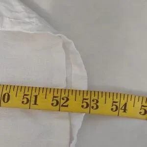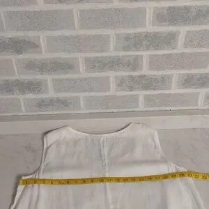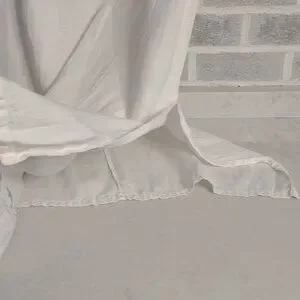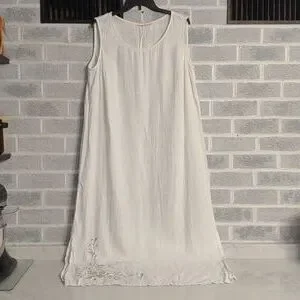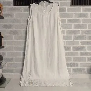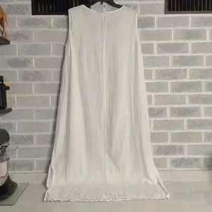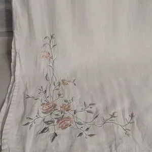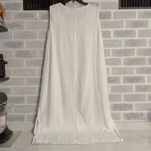 Women's Long White Dress with Beautiful Pink Rose Embroidery. No tags on Dress but the fabric feels and looks like linen. Slightly see through. Would make an excellent cover-up for vacation on the beach. Lightweight. Crew neck. Side vents near the bottom. Has a few pulled threads in the embroidery (shown in pictures). Overall in excellent pre-owned condition.