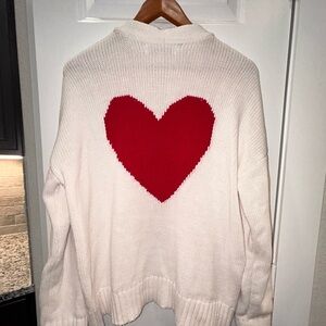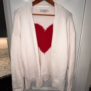 This charming cardigan from LOFT features a cozy knit in a soft white hue, highlighted by a striking red heart design on the back. The textured pattern adds warmth and style, making it a perfect addition to your sweater collection.