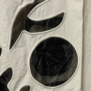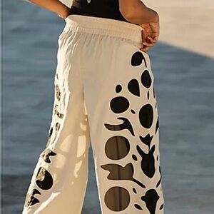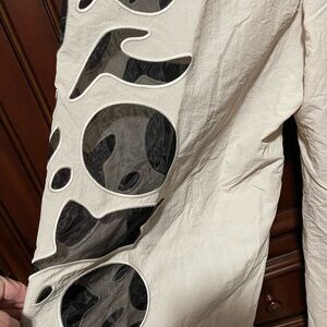 Make a statement in these so bold wide-leg warmup pants featured in a breezy style with an elastic waistband and eye-catching sheer graphic detailing ...inseam about 30inches
