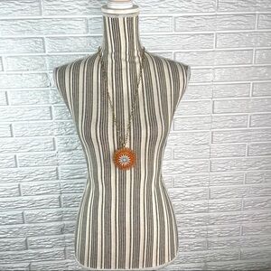 Long Rhinestone and Resin Medallion Pendant Statement Necklace Orange Grey Gold Tone Chain