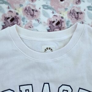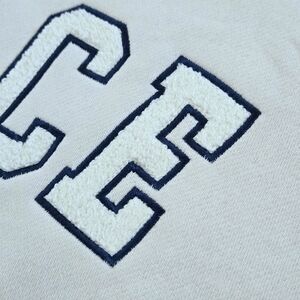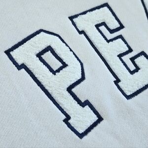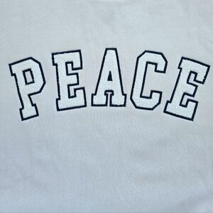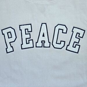 Color of sweatshirt is "whisper white" which is an off white; "PEACE"☮️ on front chest in collegiate🏫 font made of sherpa🐑 with an embroidered🪡 navy🇺🇲 blue💙 outline