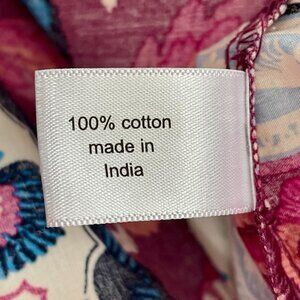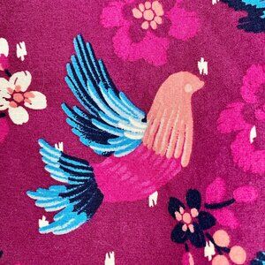 This lovely, lightweight, popover blouse from Lane Bryant is made from a 100% cotton fabric in dark pink printed with charming birds and flowers in three shades of blue, two shades of pink, peach, and white. The comfortable and flattering a-line cut is enhanced by a ruffled collar, single-button back closure, short sleeves, and decorative banding at the hem. Comfortable and loose, it's perfect for a summer picnic, a lunch date, or shopping on the weekend. Conveniently machine washable and dryable. A great addition to a capsule wardrobe!