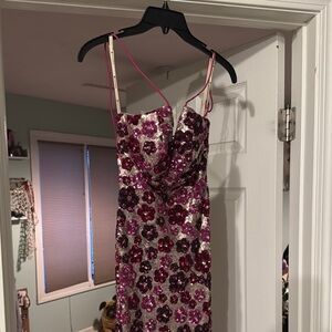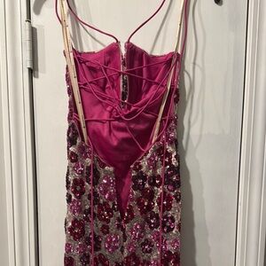 Elegant Sherri Hill prom dress. Features pink floral pattern. Spaghetti straps and fitted silhouette.