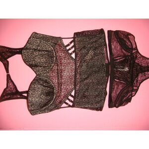 Victoria's Secret unlined 36C BRA SET+M+CORSET bustier Black floral lace strappy