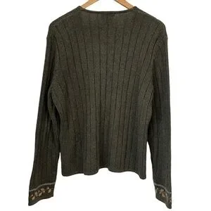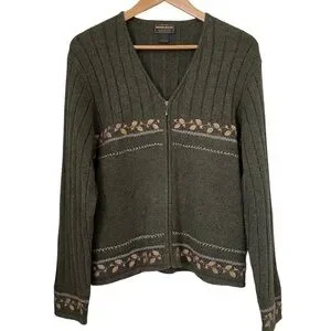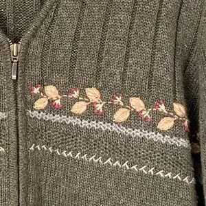 This zip up cardigan sweater has beautiful needlework along the front of the sweater and on the edges of the sleeves. Sweater is in excellent, pre-owned condition.