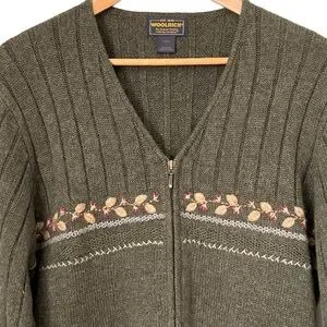 Woolrich Women’s Green Zip Cardigan with Needlework Cottagecore Size Large
