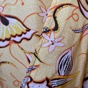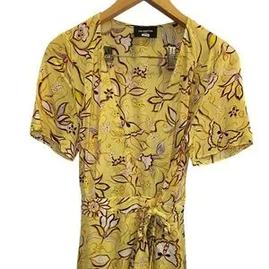 Yellow floral (100% Viscose). Wrap dress. V-neck. Short sleeves. Front button closure. 50" from shoulder to hemline. Imported.