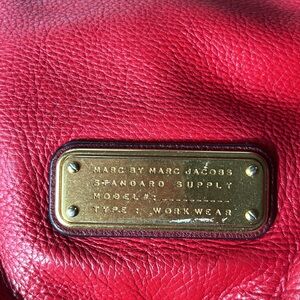 MARC by Marc Jacobs, signature red leather Hillier Hobo style bag, spacious, magnetic clasp, inner lining, zipper pocket and two extra pockets inside. Can be an accessory piece to add a pop of color to your outfit. All red leather. Thick sturdy shoulder and brass clasps. Small mark on right side not obvious .