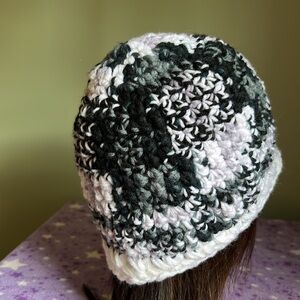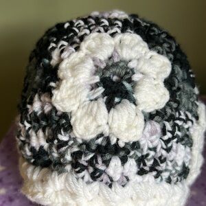 Crochet handmade flowers beanie medium soft acrylic yarn double strings for warmth clean never worn new. Warmest hat wash suggestion in tied pantyhose sock or cloth laundry bag to prevent piling fuzz and maintain form and beauty. Moveable flowers.