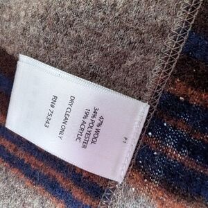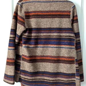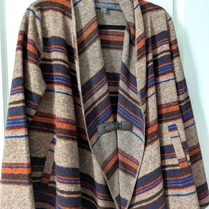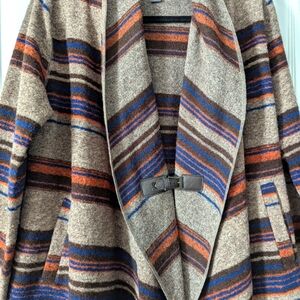 Traditional Southwest blanket fabric styled lightweight sweater jacket with large shawl collar, flowing drape, leather clasp closure to cinch in front. 2 pockets. 47% Wool, 34% Polyester, 19% Acrylic. Beautiful Primary Colors- Navy, Orange, Brown, Tan. Bought on travels in the Southwest US. Excellent condition.