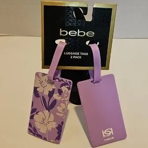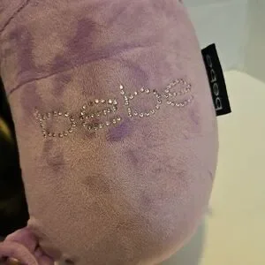 Soft and comfortable purple travel pillow by Bebe. Includes two matching luggage tags.