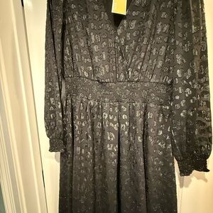 This stunning black dress by Michael Kors features an asymmetrical hemline and elegant bishop sleeves, perfect for a cocktail night out. The v-neckline and ruched detailing add a touch of sophistication, while the pleated design enhances its chic appeal.