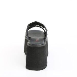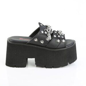 Demonia Ashes-08 in Black Vegan Leather with a 3 1/2" (90mm) Chunky Heel, 2 1/4'' (57mm) Cut Out Platform Double Strap Slide Sandal Featuring Flat & Skull & Crossbones Studs & Metal Chain Adorned Straps, ASH08/BVL