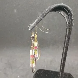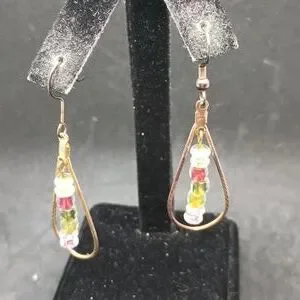 A pair of earrings with teardrop shapes and some fun colored beads in the center. No brand marks found.