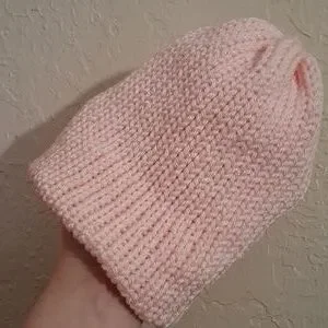 This listing is for one handmade double layer knitted one size fits most, baby. Beanie in the color soft pink yarn is 100%. Acrylic can be made in other colors. can add pom pom upon request