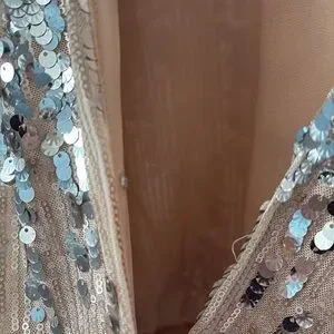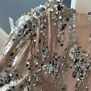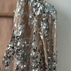Absolutely stunning top covered in small tan sequins and silver palettes. This top is sure to turn heads!!