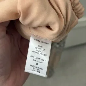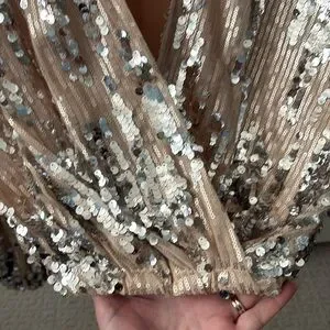 It’s a poly blend. Dry clean recommended. Surplice front. Elasticized hem. Sequin embellishments throughout. Fully lined inside.