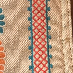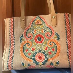 Spartina 449 Multi-Color Dulce Paige Tassel Tote in excellent used condition with a minor flaws on back side of purse that isn’t shown when carrying - please see all photos - the light marks that may be able to be cleaned but haven’t attempted. They are not super noticeable. Inside of purse is excellent condition with one tiny black dot - please see all photos. Cotton with leather straps and beautiful pattern graphics. Has three inner compartments
