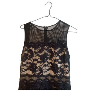 This beautiful dress is black lace over a beige slip. It has a zipper up the back and an A-line frame. In excellent condition.