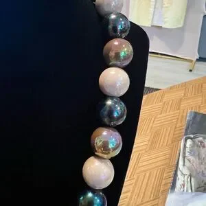 This exquisite necklace showcases a harmonious blend of cream and gold beads, each adorned with intricate floral patterns. The medium-length design ensures it sits elegantly around the neck, making it a versatile piece for any occasion.