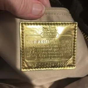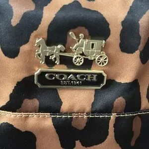 Front has pin mount, gold tone, horse carriage, Coach logo