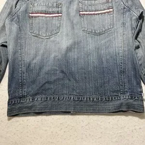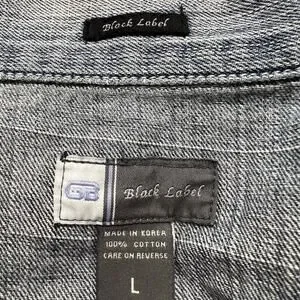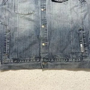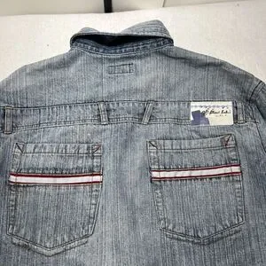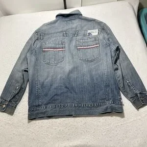 Great condition GB Black Label button up jean jacket in a men's large in a light blue distressed color with a logo patch design on the back.