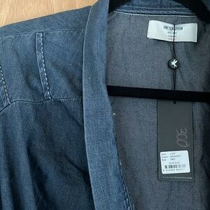 The Midnight Kimono is a dark blue, light denim kimono style jacket. Features a tie waist band and wide 3/4 sleeves. Model wears a size small. Fabric: 100% cotton. Cold machine wash.