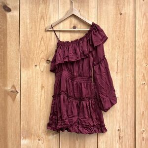 MISA Los Angeles Lucien Dress Off Shoulder Mini Satin Ruffle Cranberry Sz XS