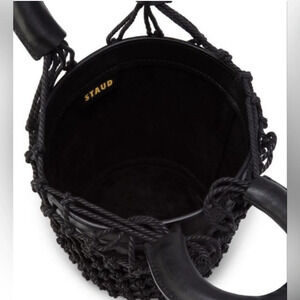 Elevate your accessory game with this iconic STAUD Moreau leather woven bucket mini bag in classic black. Crafted from smooth leather with intricate knotted netting and a structured base โ the perfect blend of minimalism and modern luxury.