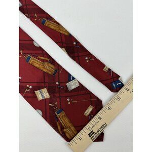 This Italian-made silk tie features a golf-themed design on a red plaid background, ideal for elevating tailored or professional ensembles.