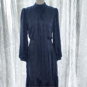 SALONI NAVY BLUE ISABEL LONG SLEEVE C BOW SILK BLEND JACQUARD MAXI DRESS